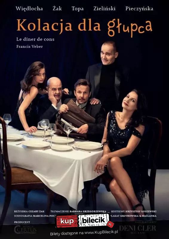 bilety: Tytułowa "Kolacja dla głupca" ma być jedną z wielu, które we wtorkowe wieczory Pierre Brochant, bogaty wydawca i człowiek sukcesu, urządza ze swoimi wpływowymi przyjaciółmi. Na każdą zapraszają wyjątkowych nieudaczników, będących nieświadomymi niczego obiektami kpin i uczestnikami konkursu na największego frajera. Jak to często w komediach bywa, nieoczekiwany splot wydarzeń powoduje, niespodziewany zwrot akcji, w wyniku którego nie dochodzi do zaplanowanej kolacji a spotkanie głównych bohaterów Pierra Brochanta i Francoisa Pignona przeradza się w arcyzabawny spektakl. W komiczny sposób ukazuje bohaterów, ich słabości i wady. Kolacja dla głupca - to hit teatralny, od lat grany na deskach wielu światowych teatrów! To znakomita gra aktorska, wartka, zabawna akcja i zaskakujący finał. Kolacja dla głupca - Cezary Żak, Bartłomiej Topa artyści: Cezary Żak, Bartłomiej Topa, Małgorzata Pieczyńska, Agnieszka Więdłocha, Marta ChodorowskaKOLACJA DLA GŁUPCA – tytułowa „kolacja dla głupca” ma być jedną z wielu, które we wtorkowe wieczory Pierre Brochant, bogaty wydawca i człowiek sukcesu, urządza ze swoimi wpływowymi przyjaciółmi. Na każdą zapraszają wyjątkowych nieudaczników, będących nieświadomymi niczego obiektami kpin i uczestnikami konkursu na największego frajera. Bilety do nabycia na: KupBilecik.pl |